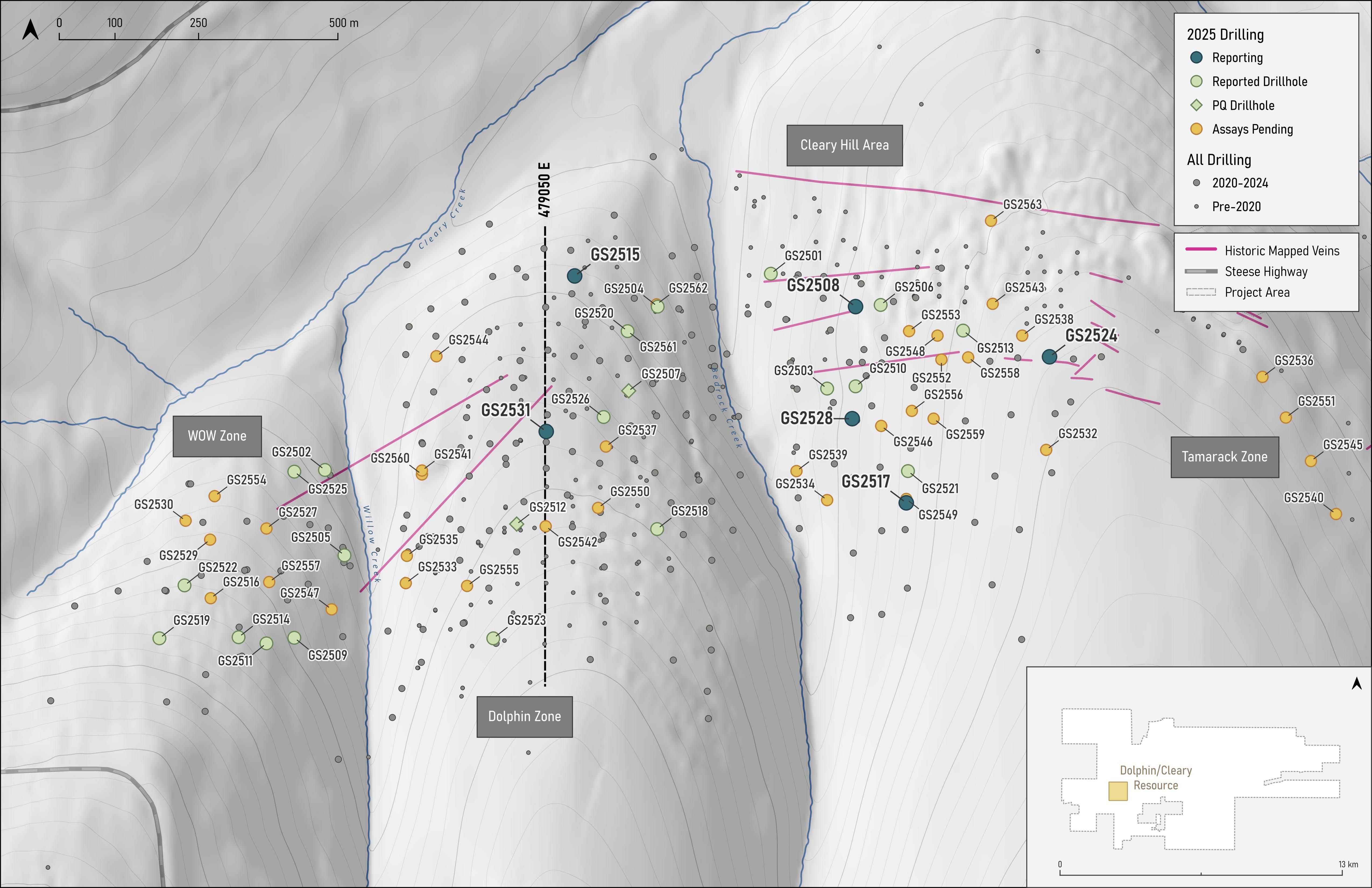 Recent drilling in the Dolphin zone confirms strong, continuous mineralization, with broad intercepts of higher grades. The near-surface intercept in GS2531 indicates promising potential for higher grades, supporting the concept of a potential higher-grade starter area.
