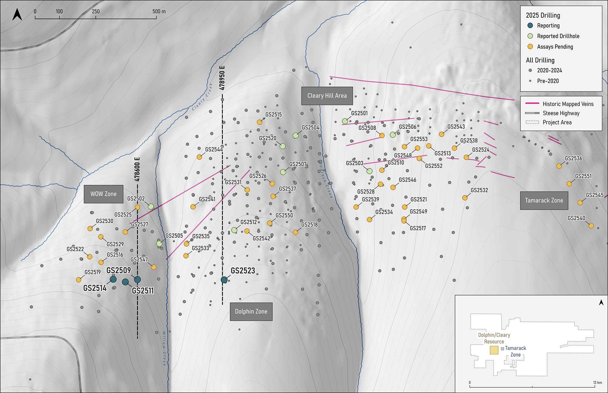 2025 drill program has several objectives: to enhance and upgrade existing resources, explore areas for expanding current mineralization, and define the mineralized boundaries, primarily in the Dolphin and Cleary Zones. These goals are being achieved through a combination of exploration, geotechnical, and metallurgical test holes. There is still significant exploration potential to the west and east of the known deposit.