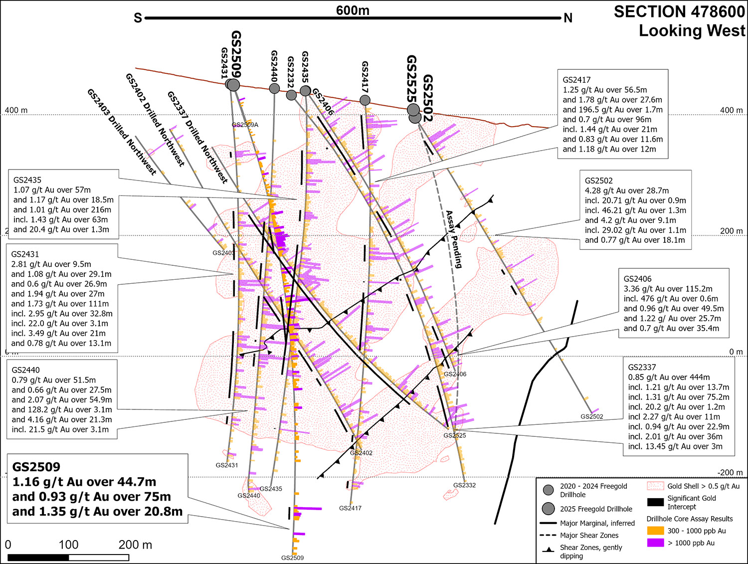 GS2509, GS2511 and GS2514 were all drilled in the southern portion of the WOW Zone. All three holes intersected significant zones of over 1.0 g/t Au mineralization, continuing to validate the WOW Zone’s potential to host higher-grade mineralization. Mineralization in the WOW Zone remains open to depth and along strike to the west and southwest.