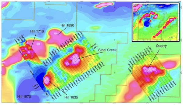 - SC2105 through SC2107 were drilled in the Steel Creek area. The holes were all drilled within the weaker portion of the magnetic high at Steel Creek.