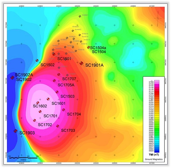 - Two holes were drilled in the Quarry target (SC2101, SC2102). The Quarry target tested a portion of the approximately 8km long magnetic anomaly.